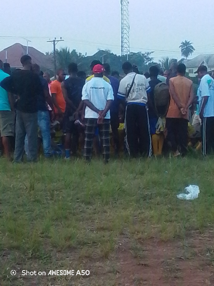This image captures a daytime scene in Umuezee Ezuhu Nguru, Nigeria, depicting approximately 15-20 adult males gathered on an open grassy field