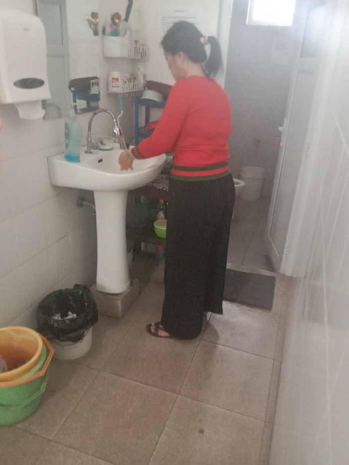 A woman in a red sweater and black pants washes her hands in a white sink. The sink is attached to a white pedestal. Behind her, there is a shelf with various items. Next to the sink, there is a trash can filled with a black plastic bag. There are also several green and yellow plastic buckets on the floor. The bathroom has tile flooring and white walls.