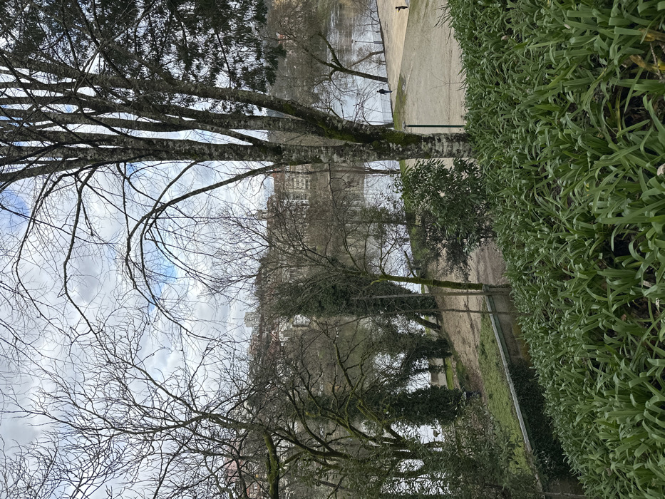 A park scene features bare trees against a sky with clouds. A river runs parallel to a walking path where a person is visible. The path is lined with green bushes and grass. A building stands in the background, partly obscured by the trees. The image composition showcases a blend of nature and urban elements in a serene outdoor setting.