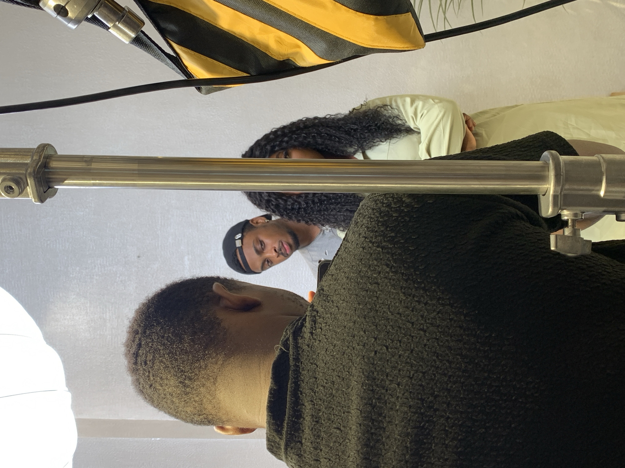 An indoor scene, likely a professional photo studio, is depicted in Moba, Nigeria. In the immediate foreground, the back of an individual with short, dark, tightly curled hair and a dark, textured top is visible, obscuring their face. This individual is holding a smartphone, suggesting they are either photographing or recording the scene. A large, white, rectangular softbox is positioned in the upper left, providing primary illumination. A brass-colored metal light stand extends vertically from the bottom center, partially segmenting the background. To the right of the stand, a black and yellow striped sandbag hangs from additional grip equipment. In the background, behind the light stand and foreground individual, two subjects are positioned against a plain white wall. On the left, a male with dark skin, a short beard, and a black baseball cap worn backward is wearing a grey t-shirt and looking directly towards the foreground. To the right, partially obscured by the light stand, a female with long, dark, curly hair is visible from the chest up, wearing a light-colored long-sleeved top and having her arms crossed. Her gaze is also directed towards the foreground. A hint of green foliage is visible on the far right background.