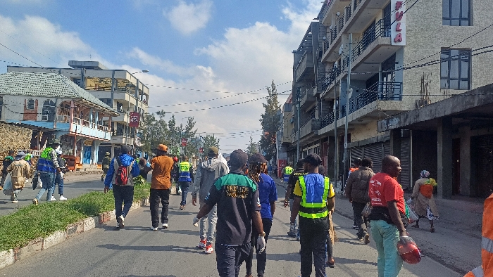 The image depicts an urban street scene in Rubavu, Rwanda, under a partially cloudy blue sky. Approximately 20-30 individuals, primarily adults, are observed walking away from the camera's perspective along an asphalt road. On the left side of the street, a raised median with green vegetation borders the road. Beyond this, a two-story building with a light blue and white facade, gabled roof, and balconies is visible, with additional multi-story buildings further in the background. On the right side of the street, a multi-story building with a gray exterior and multiple balconies prominently features a vertical red sign spelling "TULA" on its upper floors. Overhead utility lines are visible crossing the street. Many individuals in the group wear casual attire. Several are equipped with high-visibility vests, including yellow/green and blue variations. In the immediate foreground, a person wears a dark blue shirt with green shoulders bearing the text "SERENITY PROTECTION" and white gloves. Slightly further ahead on the right, an individual in a red t-shirt and light green pants carries a red helmet-like object in their right hand. Multiple individuals carry backpacks. One person on the far left side of the road carries a large, light-colored bundle over their shoulder. The individuals appear to be moving as a collective group in the same direction.