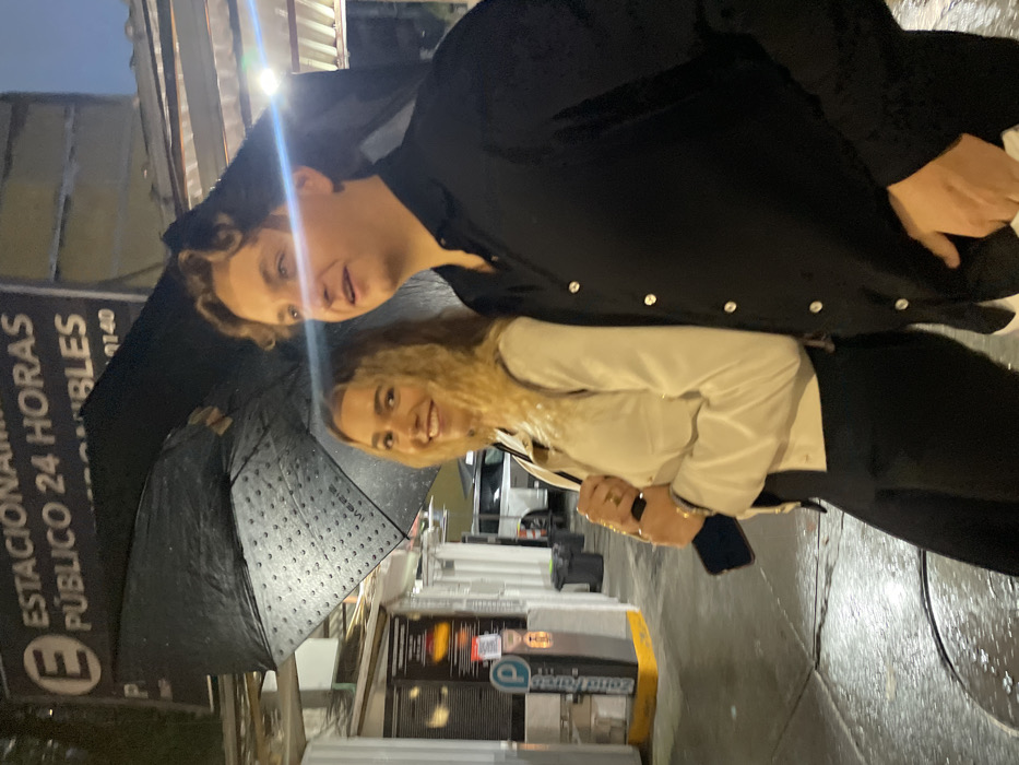 The image captures two individuals, a female and a male, sharing a black umbrella outdoors at night in Mexico City, Mexico