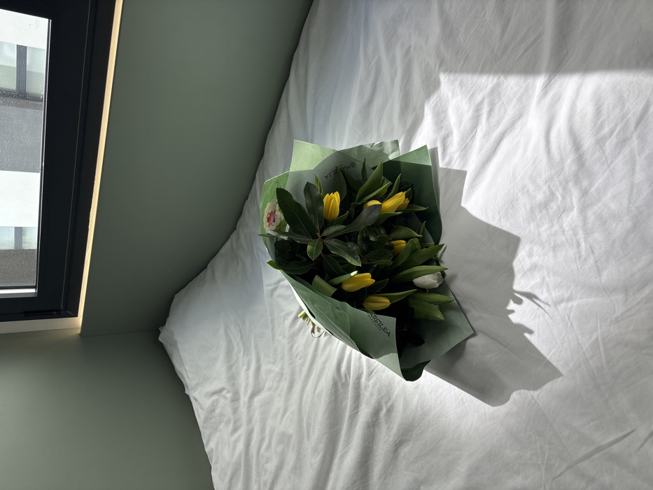 An indoor scene in Getafe, Spain, depicts a bouquet of flowers resting on a white, rumpled bedsheet