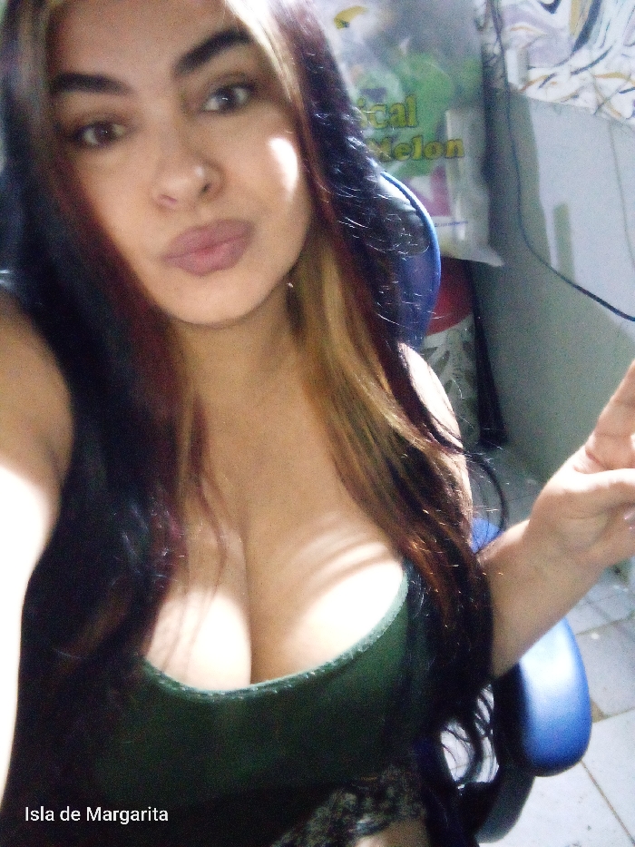 A woman with light skin, brown eyes, and dark brown hair with blonde streaks poses in an indoor setting. She wears a dark green top that reveals cleavage. She is seated in a blue chair, partially visible. In the blurred background, a wall with a poster and a few objects are present. The text "Isla de Margarita" is printed at the bottom left corner.