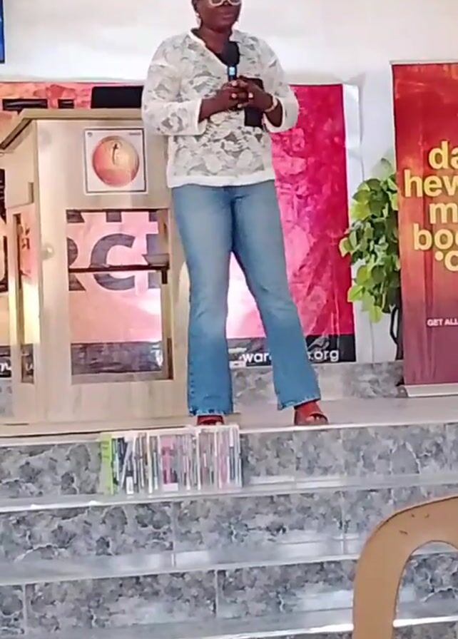 A woman stands on a stage speaking into a microphone. She has her hair in a bun and is wearing glasses, a lace top, blue jeans, and sandals. Behind her are posters and a potted plant. She is smiling as she speaks. The stage has gray tile steps.