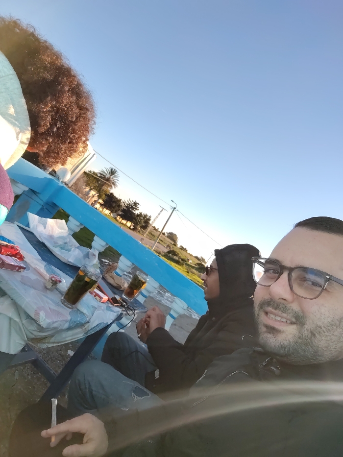 Three individuals gather outdoors, likely at a park, under a clear blue sky. A table is set with glasses of a dark beverage, possibly tea, and other small items. Two individuals are seated, one wearing glasses and smiling, holding a cigarette. Another with a hoodie on. A third person with large curly hair is partially visible. The background includes trees, a power pole, and a road.