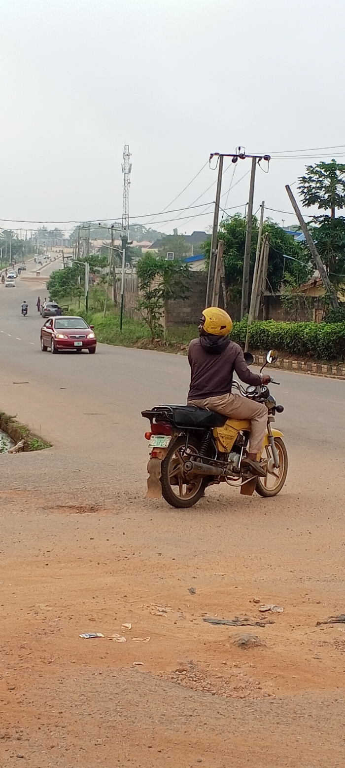 A man wearing a yellow helmet rides a yellow motorcycle on a paved road next to a dirt shoulder. He is facing away from the camera, toward a red car approaching on the road. Power lines and a cell tower are visible in the background, along with trees and buildings. Debris is scattered on the dirt shoulder. Other vehicles are further up the road. The sky is overcast.