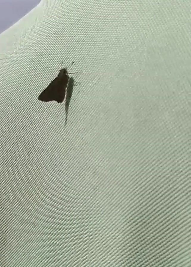 man wearing a light green polo shirt with a dark brown insect clinging to the back of his shirt