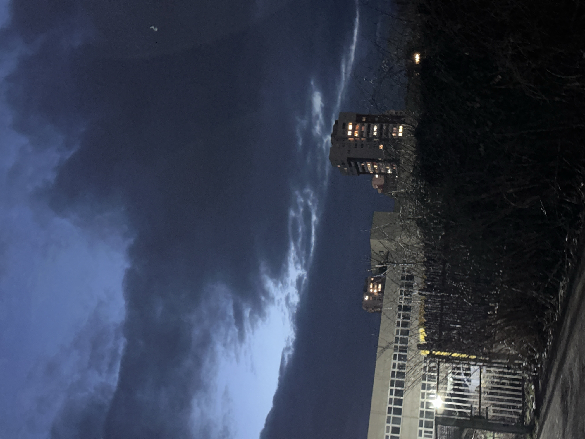 The image depicts an urban scene in Sofia, Bulgaria, under a dark, overcast sky at dusk or night. The sky, occupying the upper two-thirds, is dominated by dense, dark blue-grey clouds with lighter blue areas visible between formations. A faint, pale crescent object is discernable in the upper right portion of the sky. In the midground on the left, a light-colored, multi-story building with multiple horizontal rows of rectangular windows is visible. A white metal gate or fence stands partially open in front of this building, illuminated by an off-frame light source casting a yellow hue onto dense, dark bushes directly behind the fence. Further right, a taller, darker multi-story residential building rises above the first structure, exhibiting several windows with warm, yellow internal illumination. The immediate foreground features a mass of dark, tangled vegetation, likely bare branches and bushes, obscuring the ground level. A dimly lit segment of what appears to be a paved surface is visible in the lower left corner. No individuals or discernible actions are present.