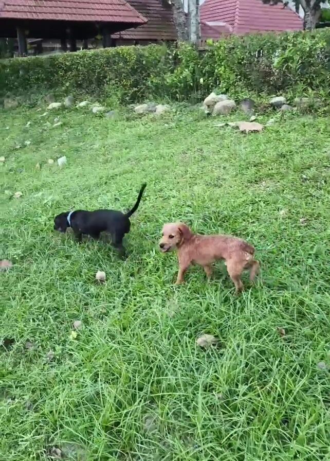 two small dogs on a grassy lawn, with a building and foliage in the background. One dog is black with a blue collar, and the other is light brown. Both dogs are walking, sniffing the ground. The grass is green with scattered dry leaves and small stones. The building in the background has a red roof and white walls, partially obscured by green foliage. The overall environment appears to be a park or garden setting.