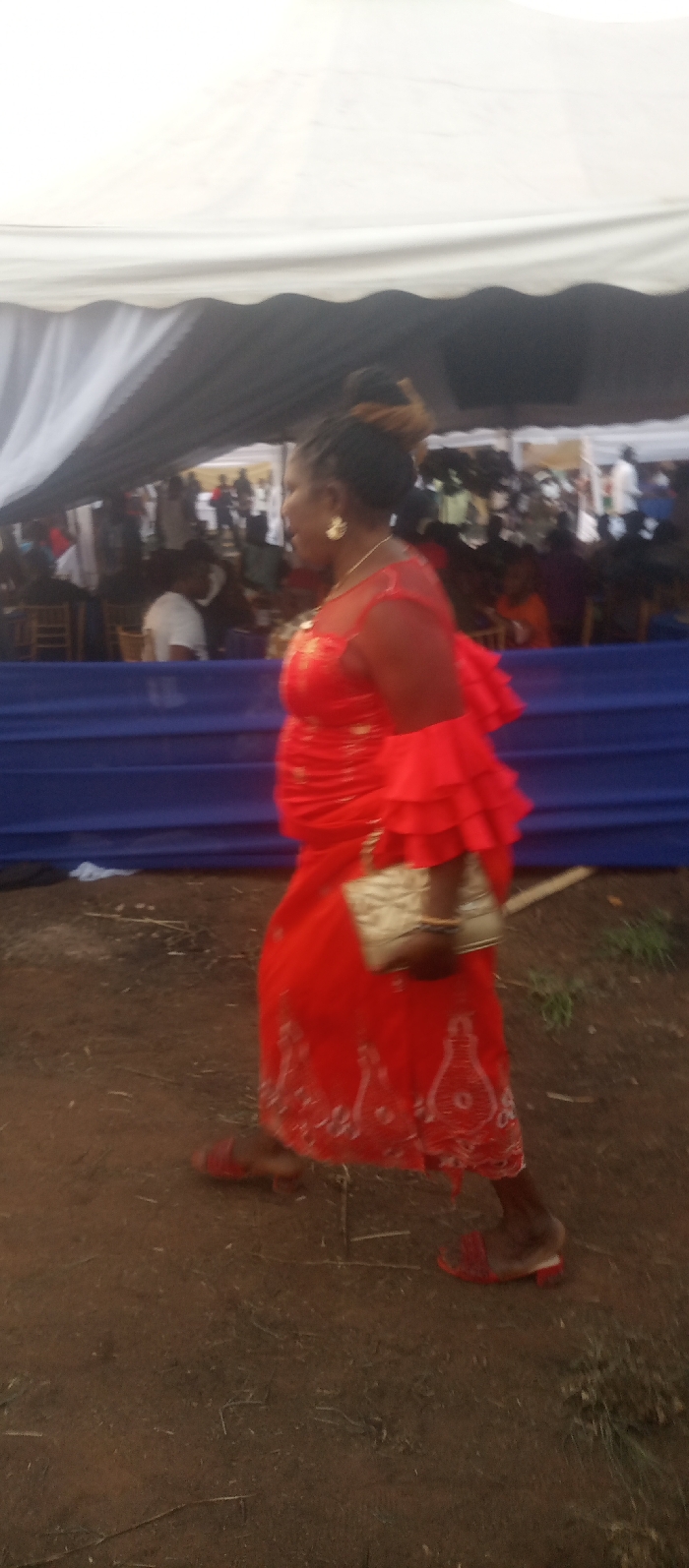 A woman in a red dress walks past a blue barrier in an outdoor setting. The dress features a ruffled shoulder design and white patterning along the hem. She carries a shiny clutch and wears red sandals. In the background, a white tent is visible with a gathering of people underneath. The ground appears to be dirt or soil. The image quality is slightly blurred.
