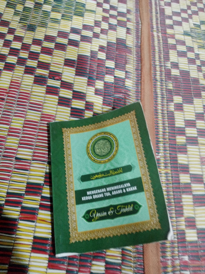 The scene depicts a small green-covered book resting on a woven mat with a multicolored pattern. The mat exhibits a checkerboard design comprising horizontal and vertical bands of red, yellow, white, and dark blue/black. A vertical seam with a tan border runs along the right side of the mat. The book, positioned slightly angled towards the bottom right, features a gold ornamental border and a central circular motif on its cover. Text on the cover includes Arabic script, and Indonesian phrases "MENGENANG MENINGGALNYA KEDUA ORANG TUA, ABANG & KAKAK" (Commemorating the Passing of Both Parents, Brother & Sister) and "Yasin & Tahlil." The book cover shows minor wear along its edges. No individuals are present in the image. The environment is an indoor setting, possibly within a residence in Lhokseumawe, Indonesia.