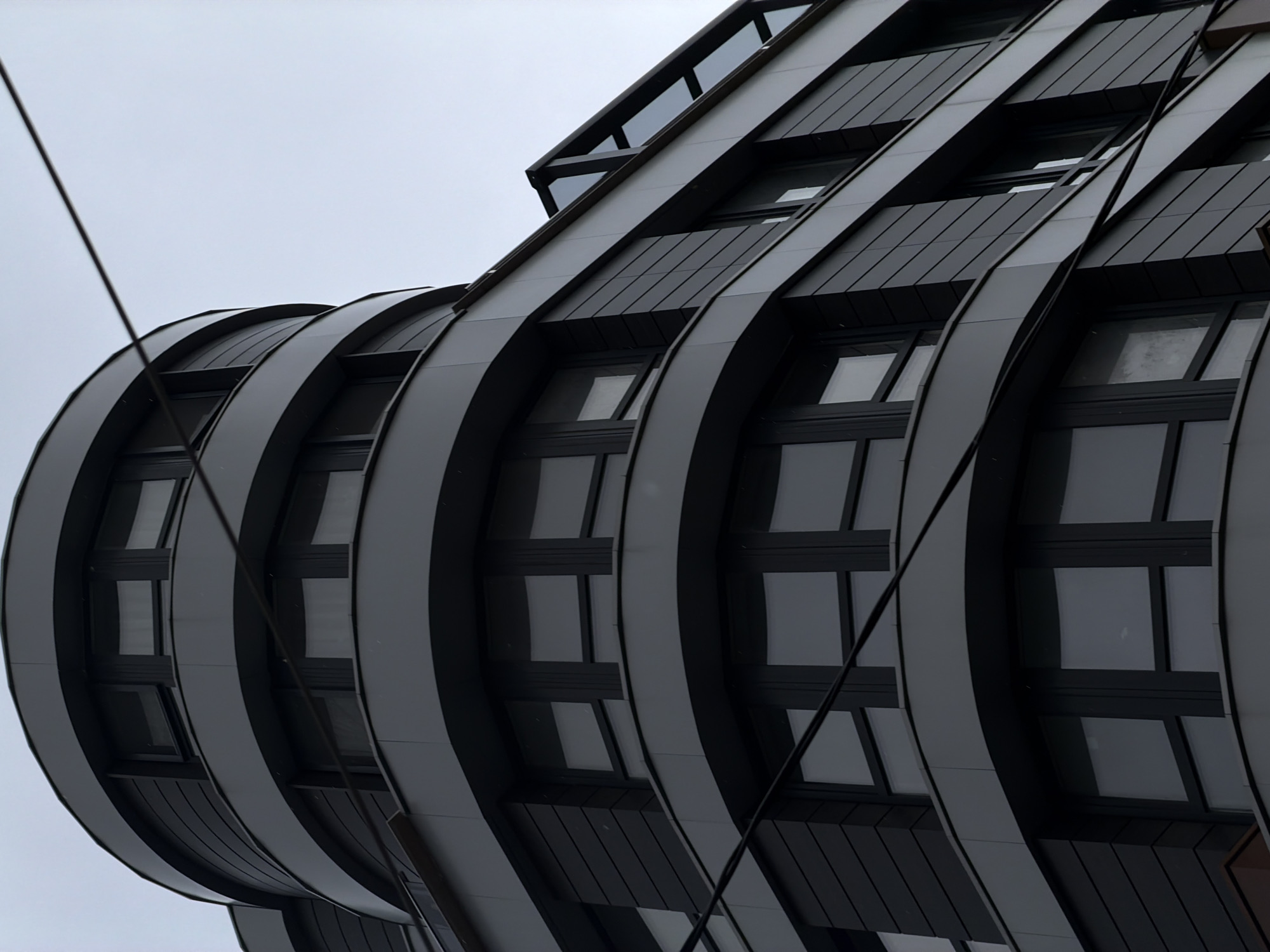 The image displays the exterior of a multi-story building in Sofia, Bulgaria, viewed from a low angle against a light grey, overcast sky. The structure exhibits a modern design with prominent curved sections on its left side, contrasting with a flatter, more rectilinear facade on the right. The building is uniformly clad in dark grey panels, some sections featuring horizontal ridged detailing. Multiple dark-framed rectangular windows are visible across various floors, reflecting the muted sky. One window on an upper curved section is partially ajar. Two dark utility cables diagonally traverse the scene from the upper left to the lower right, passing in front of the building. No individuals, specific street-level features, or discernible actions are present in the frame.