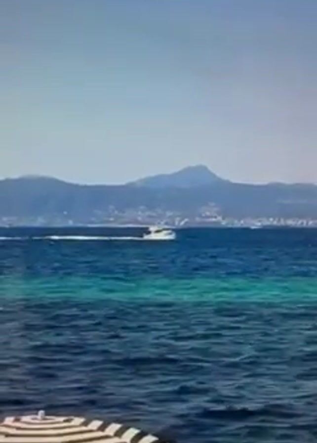 view of the ocean from a beach with a striped umbrella in the foreground. In the distance, a motorboat is moving across the water, leaving a white wake behind it. Behind the boat, there is a coastline with a city and mountains visible. The sky is clear and blue. The water is a mix of dark blue and turquoise.