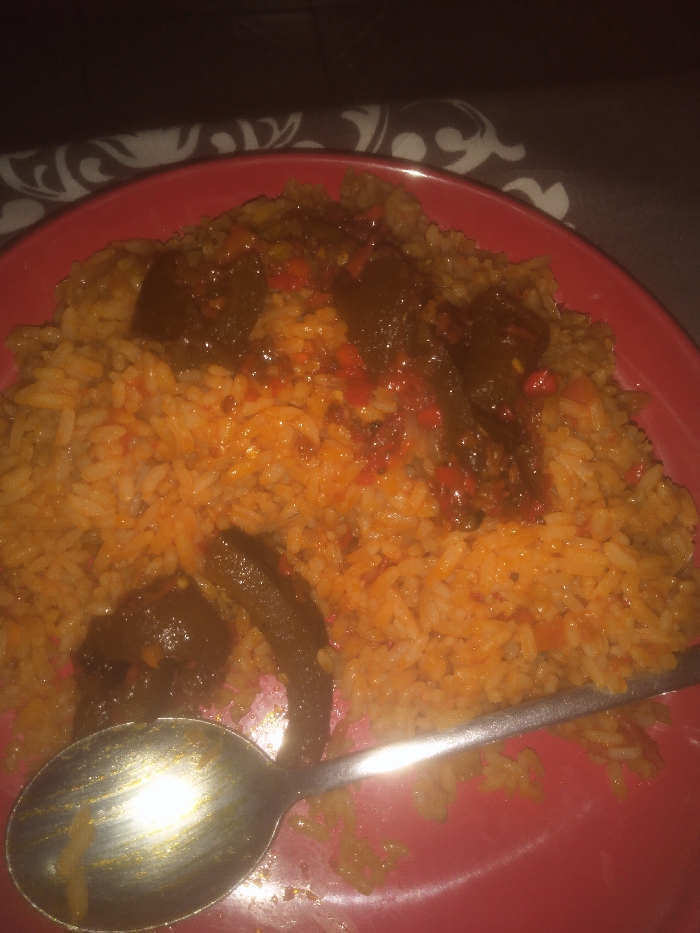 - "A red, circular plate is centrally positioned, containing a serving of reddish-orange rice, consistent with jollof rice" by FM-ywGBw1, licensed under CC BY 4.0