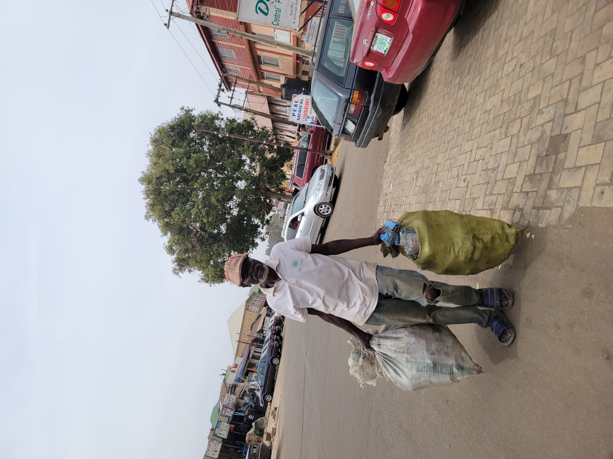 The image displays an urban street scene on Shenahan Street, Jos, Plateau State, Nigeria, in front of a building identified by signs as "PEAL MEDICAL LABORATORY" and "Central Pharmacy" at No. 10. In the foreground, a dark-skinned male adult, appearing elderly, stands centrally, directly facing the camera. He wears a white short-sleeved polo shirt with a green circular logo featuring text, torn blue jeans with a tear on the left knee, dark blue slide sandals, and a reddish-orange baseball cap. He has a white/grey beard. He holds a large, irregularly shaped, light-colored fabric sack in his left hand and a large, olive-green fabric sack, visibly containing plastic bottles, in his right hand. The man stands on an asphalt road. To his immediate right, a sidewalk constructed with light-colored interlocking pavers in a herringbone pattern is visible. Parked on or adjacent to this sidewalk are a red Toyota Corolla sedan (Plateau State license plate SHD-387AG) and a black station wagon (possibly a Volkswagen Passat). Behind these vehicles stands a multi-story red brick building with multiple windows. Utility poles with numerous overhead wires run along the right side of the street. To the left of the central figure, the asphalt road extends into the mid-ground, showing a silver Toyota Corolla sedan in motion and other parked vehicles further down the street. Various commercial buildings, some with awnings and signs, line the street in the background. A large, dense green-leafed tree is situated in the mid-ground, towards the right side of the frame. The sky is uniformly light grey and overcast.