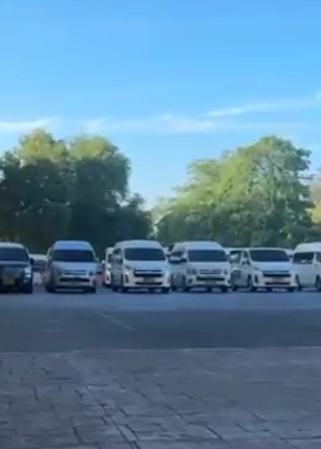 n outdoor scene under a clear blue sky. Initially, the camera faces a line of vans, with people standing near them. The camera then shifts focus to a young boy, who is seen from the back. He turns around to face the camera, revealing his features, and then points towards the vans. The setting appears to be a paved area outside a building with columns, possibly a transportation hub or parking area.