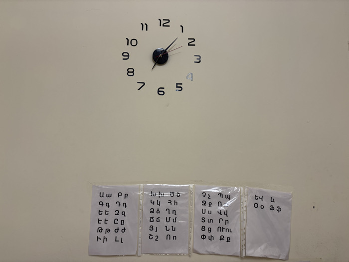 A wall has a modern clock with black numbers and hands. Below the clock are four sheets of paper in plastic sleeves. The paper appears to contain a printed alphabet or symbols in a language that is not readily identifiable. The text is arranged in columns, with pairs of symbols displayed next to each other. The wall is plain and light-colored.