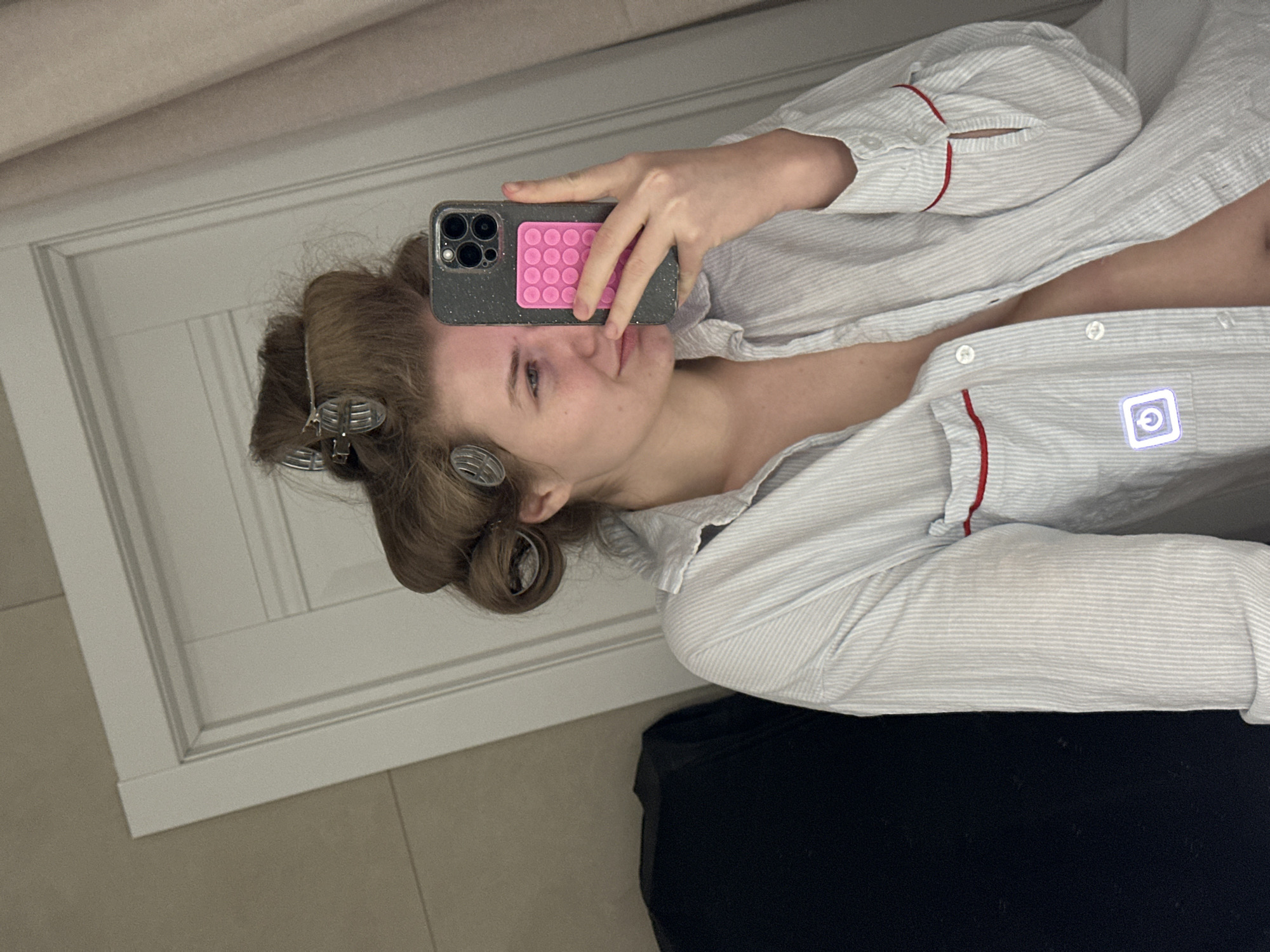 A woman is visible in a selfie taken in a mirror, seemingly indoors. She has her hair in rollers and is wearing a white and light blue striped pajama top with red trim. She is holding a phone with a dark case and a pink pop-it style accessory on the back. A dark-colored garment, possibly pants or a blanket, is visible at the bottom edge of the frame. The background includes a white door or wall panel. The location in the city of Kliuchishchi, Russia, cannot be determined from the image.