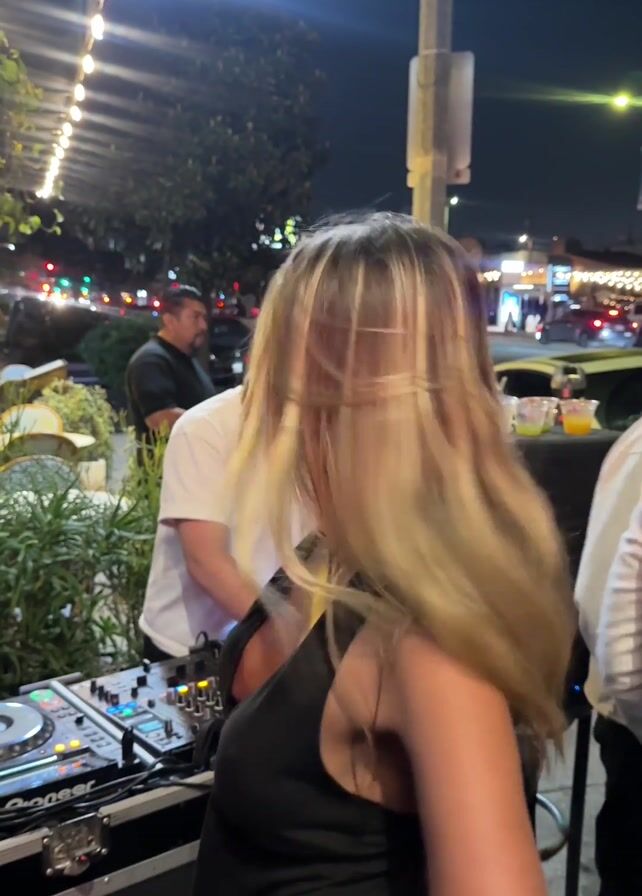 At night, a woman with long blonde hair is standing outdoors, looking into the camera and making a face. She is wearing a black sleeveless top. To her left is a DJ setup with a Pioneer mixer. Behind her, people are milling around, and a street with bright lights and vehicles is visible. Strings of lights are hanging overhead. There is a sign post to her right and greenery to her left.