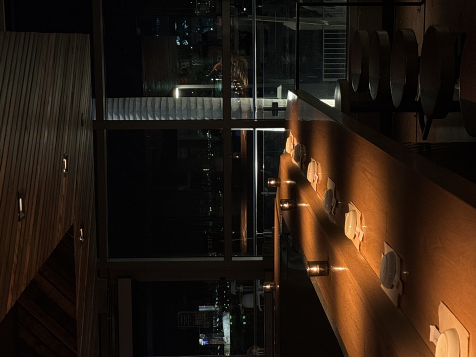 A modern restaurant interior at night. A long, warm-toned wooden bar illuminated by small candles leads toward large windows showcasing a cityscape. Bar stools line the right edge. A wooden wall with slender light fixtures stands to the left. The atmosphere is intimate and sophisticated.