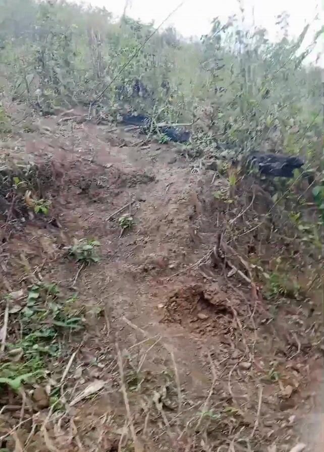 group of people walking up a steep, grassy path. The path is dirt and loose gravel. The landscape is filled with small shrubs, bushes, and dried grass. The sky is overcast. The group is small. They are wearing casual clothing. One person is wearing a hat. They are walking slowly and deliberately up the path. The camera is shaky and appears to be held by someone walking.