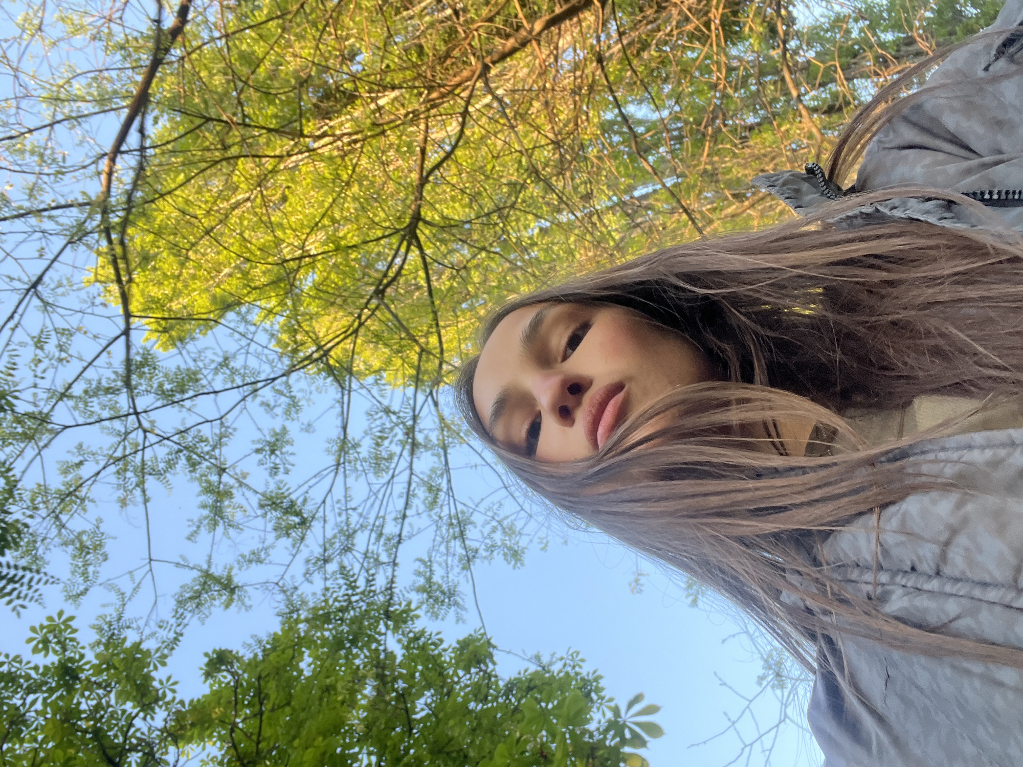 A woman is looking down into the camera from a low angle in Plovdiv, Bulgaria. Her long, brown hair is partially obscuring the view, and she is wearing a gray jacket. Above her, a sparse canopy of tree branches and green leaves fills the frame, contrasting with patches of blue sky.