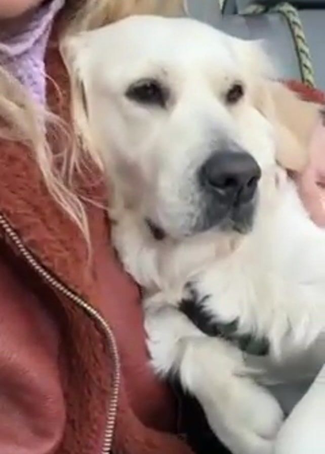 A woman is holding a golden retriever dog in the car