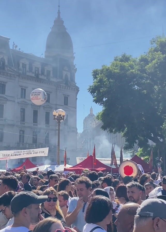 large crowd of people gathered in a city square on a sunny day. There are several red tents set up, as well as banners and flags. Smoke fills the air. A large drum with a red circle is visible amidst the crowd. A historic building with a dome is in the background, and there is also a tall tree. The crowd appears to be participating in some kind of demonstration or rally.