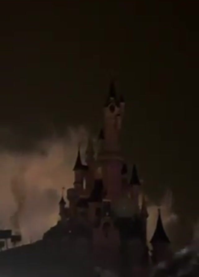 The video captures a night-time view of a castle, illuminated with vibrant colors, amid a water and light show. The castle's structure is adorned with turrets and intricate details, and it glows in red, orange, and pink hues due to the lighting effects. High water jets rise up into the dark sky, lit in varying shades of pink and purple, creating a dynamic background to the castle. In the foreground, only the tops of heads are visible from people watching the show. The overall scene is a captivating display of light and water synchronized with the castle.