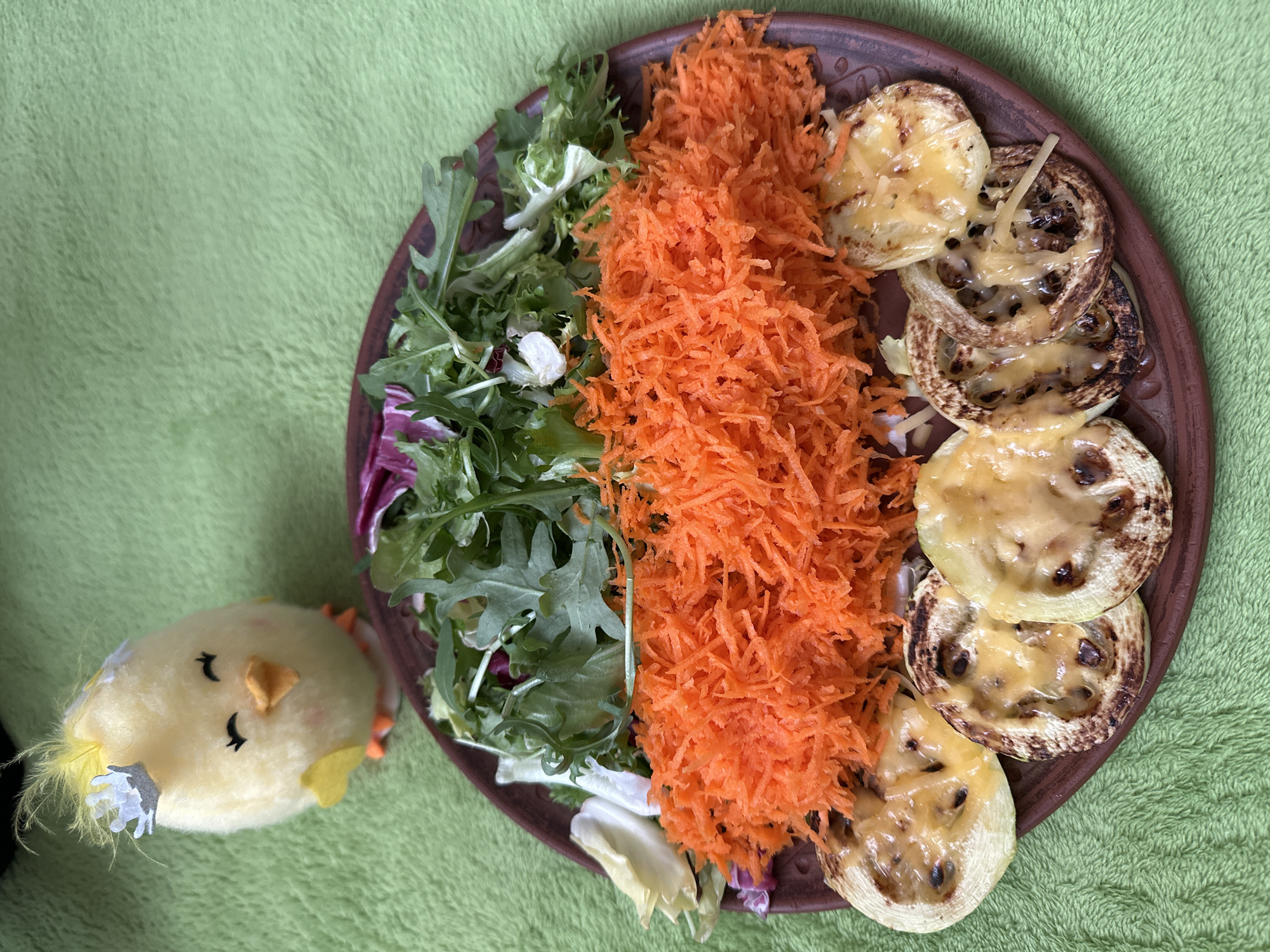 The image displays a meal plate and a plush toy chick positioned on a green, textured surface in the city of Wisła, Poland. A round, reddish-brown earthenware plate contains three distinct food items arranged horizontally. The upper portion of the plate holds a mixed green salad, primarily consisting of arugula leaves. Below this, a dense, horizontal mound of finely shredded bright orange carrots occupies the mid-section. The lower portion features approximately six to seven overlapping, round slices of grilled zucchini, exhibiting visible char marks and topped with melted, light yellow cheese. To the upper left of the plate, a small, fluffy, light yellow plush chick toy stands. It features an orange beak, closed black-line eyes, small yellow wings, and orange feet. The chick wears a small, gray paper crown with jagged peaks and additional white paper flower decorations on its head. The overall environment is a uniformly green, soft, and textured fabric surface.