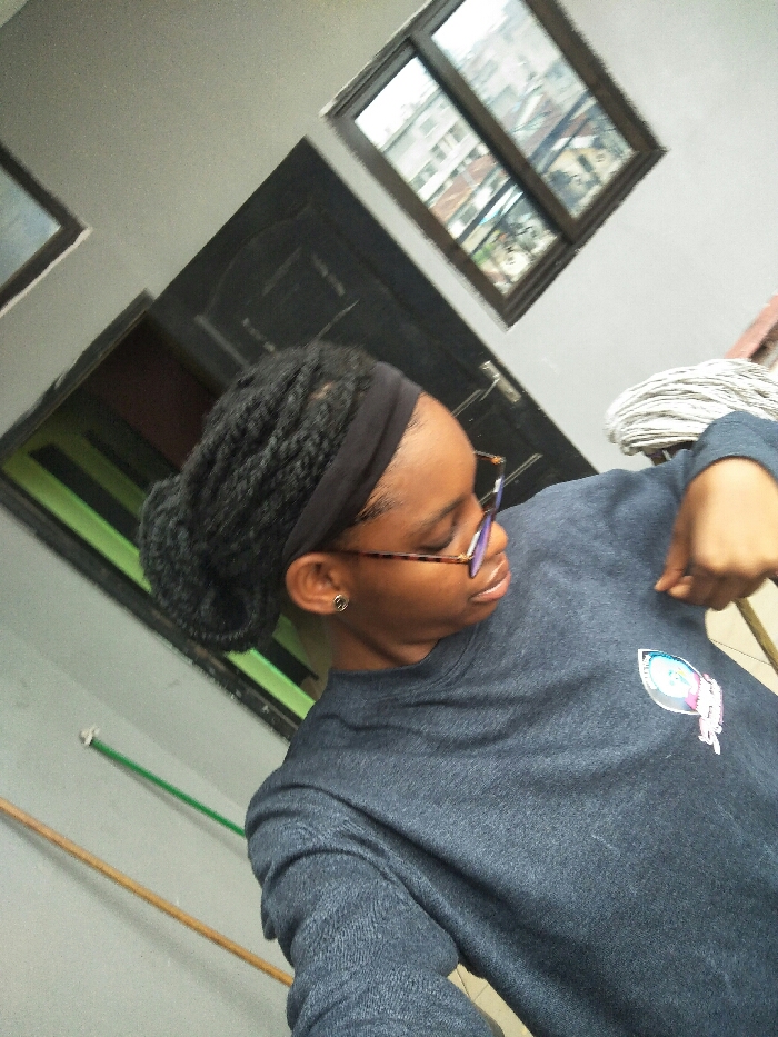 The image displays a young individual, presumed female, situated within an indoor or covered urban environment in Cotonou, Benin. The subject has dark skin, wears dark braided hair styled in a bun, secured by a black headband. Brown tortoiseshell-framed glasses with apparent purple-tinted lenses are worn. A small, circular stud is visible in the left earlobe. The individual is dressed in a dark grey long-sleeved crew-neck sweatshirt, featuring a colorful, shield-shaped graphic on the left chest. The subject's right hand is raised, with fingers positioned near the graphic on the sweatshirt. The head is turned to the right, looking in that direction. The background features light grey walls or ceiling. Two dark-framed windows are present; the upper-right window reflects multi-storied urban buildings, indicative of a city setting. A green-handled stick, consistent with a broom or mop, leans against the wall in the lower left. A coiled white object, possibly a mop head or bundle of rope, is visible in the upper right portion of the frame, behind the subject's right shoulder.