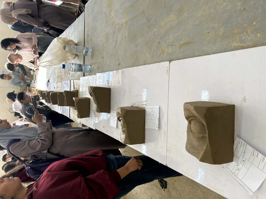 An indoor scene in Al-Qanawat Municipality, Syria, depicts a group of approximately fifteen young adults, primarily students, gathered around two long tables. The central table displays a row of eight uniformly sized, rectangular blocks of brown clay, each approximately 20-30 cm in length, placed on individual white rectangular boards. Each clay block features a sculpted, concave depression or bowl-like form on its upper surface. Small pieces of paper with handwritten text and grid lines are positioned next to or partially underneath each clay model. On the right side of the central table, two plastic water bottles and a clear plastic bag containing white, irregularly shaped material are present. The individuals are dressed in everyday attire, with several females wearing headscarves. In the foreground-left, the torso of a person in a maroon hoodie and blue jeans is visible. To their right, another individual wearing a light brown coat and light blue hijab is looking down at a mobile phone. Multiple other individuals are positioned along both sides of the tables, observing the clay models or interacting with items on the table. Some individuals in the background are bent over, appearing to be engaged in work. The environment is utilitarian, featuring light-colored walls and a light-colored floor, suggesting a classroom or workshop setting.