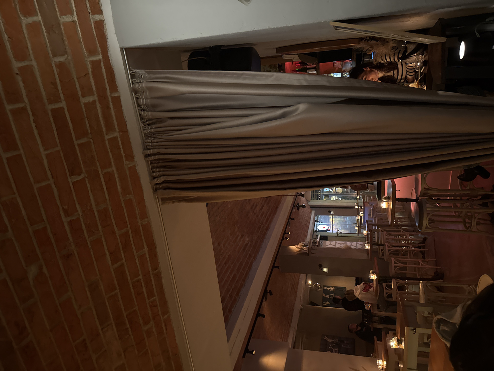 This image depicts the interior of El Cubo, located at ul. "Bratya Shkorpil" 26 in Varna, Bulgaria, during an evening or nighttime period. The scene is characterized by dim, warm illumination primarily from small candles in glass holders on tables and recessed track lighting fixtures mounted on the exposed red brick vaulted ceiling. In the right foreground, a heavy, light-brown curtain partially obscures a section of the establishment. To the right of the curtain, a female with long dark hair, wearing a horizontal striped shirt, is seated at a small wooden table, looking towards the left. On her table, a drink glass and a mobile phone are visible, alongside a small, modern lamp providing focused light. A framed object rests against the white wall to her right, and a dark, cylindrical speaker is mounted high on the wall above the curtain. The midground reveals the main seating area with multiple light-colored wooden high-top tables paired with matching stools. Some standard-height wooden tables and chairs are also present. Approximately five individuals are clearly visible. In the left midground, two males are seated at a standard table. In the center midground, a person with light-colored hair, wearing a white hooded sweatshirt adorned with a red heart design on the back, is seated at a high-top table with their back to the camera, seemingly engaged in conversation with another person standing nearby in dark attire. Red or pink ambient lighting emanates from beneath some of the high-top tables. Wall art, including a piece featuring rabbit-like figures, is visible on the light-colored walls. Structural elements include white beams and pillars, one of which supports a small decorative statue. The background shows large windows looking out onto a street, with reflections and ambient light indicating an urban environment.