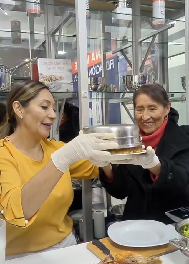 Two women are standing side-by-side at a table in what appears to be a retail setting, possibly a store or demonstration area for kitchenware. The woman on the left is wearing a yellow blouse and white gloves. She is carefully lifting a silver dome lid off a plate. The woman on the right, wearing a red sweater and a black coat, is holding the plate with both hands, also wearing white gloves. On the plate is a golden-brown, round dish that looks like a cake or casserole. In front of them on the table, there is a cooked chicken, a knife, a plate, and a container of cooked vegetables. The background includes glass shelves displaying various kitchenware items like pots and pans. There are also advertisements or brand logos visible on the shelves. Both women are smiling and appear to be revealing the dish under the dome lid.
