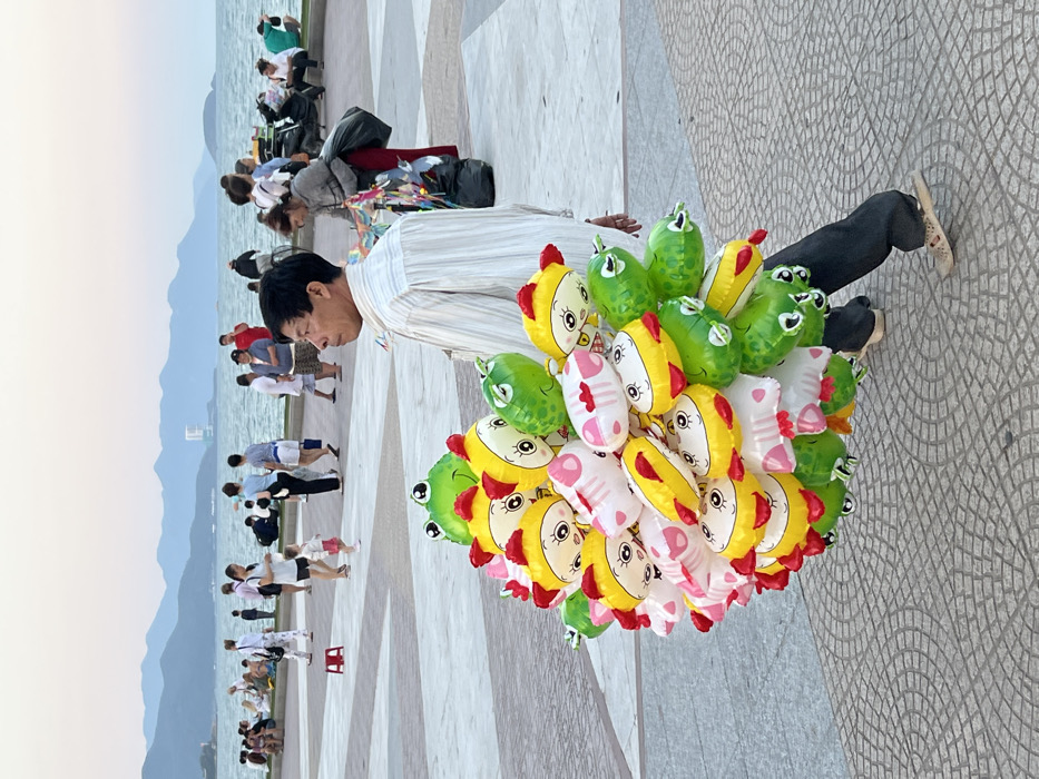 The image depicts an outdoor scene on a paved coastal promenade in Nha Trang, Vietnam, during late afternoon or early evening. In the foreground, an adult male vendor, of apparent Vietnamese ethnicity, stands or walks in profile facing right. He wears a light-colored, vertically striped long-sleeved shirt, dark trousers, and light-colored sandals. He carries a large, dense cluster of inflated foil balloons, obscuring his lower body. The balloons are primarily green frogs, yellow duck-like characters with red elements, and white/pink striped fish. The promenade surface features light and dark gray geometric paving patterns, including squares and concentric circles. In the midground, numerous individuals and small groups are scattered across the promenade near the water's edge, engaged in casual activities such as walking, standing, and sitting. A red plastic stool is visible on the paving. Further right, a parked motor scooter is present, and another individual appears to be a vendor with items like pinwheels. The background consists of the calm ocean under a pale blue sky transitioning to a soft orange hue at the horizon. Distant blue-gray mountains line the horizon, and a tall, modern building with a unique design is visible on the far left coastline.