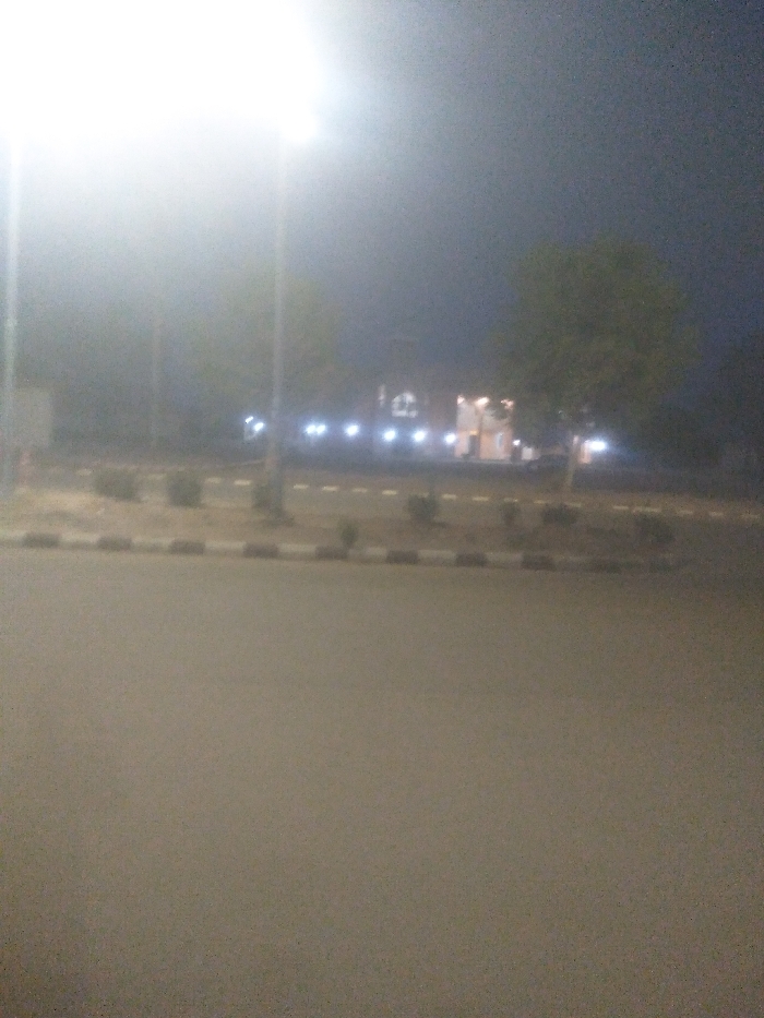 A dimly lit scene depicts a road stretching towards a building illuminated with multiple lights. The structure is positioned between trees, adding to the unclear ambiance. The foreground features a curb with alternating dark and light sections, bordered by small bushes. A tall street lamp with a bright, glaring light stands on the left, suggesting a night setting or a heavy fog. The overall image quality is poor, and the lighting is uneven.