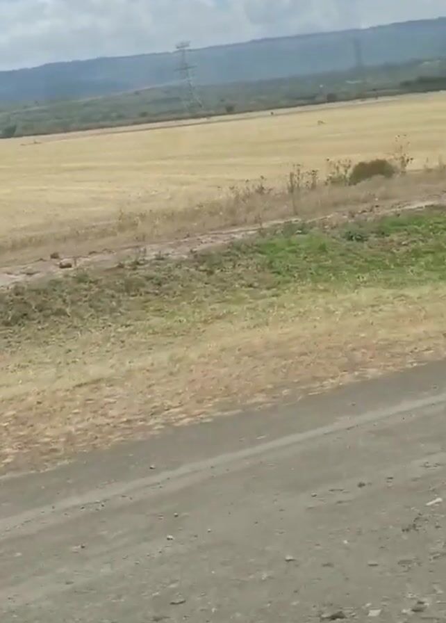 The video appears to be taken from a moving vehicle, showing a dirt road and a rural landscape. The landscape consists primarily of dry, grassy fields. A few scattered trees and shrubs dot the landscape, and there's a distant mountain range or hills visible in the background. There are utility poles along the side of the road. The sky is overcast. The camera is focused on the roadside and the fields. There's minimal detail visible in the distant background. No people are clearly visible.