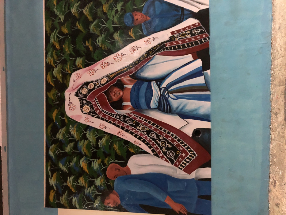 A painting shows several people resting. A central figure lies beneath a canopy-like structure with a patterned edge. Below this figure, two people dressed in blue and white appear to be sleeping on the ground. Above the central figure, another person in blue is also reclining. The background consists of dark green foliage. The overall style is illustrative.