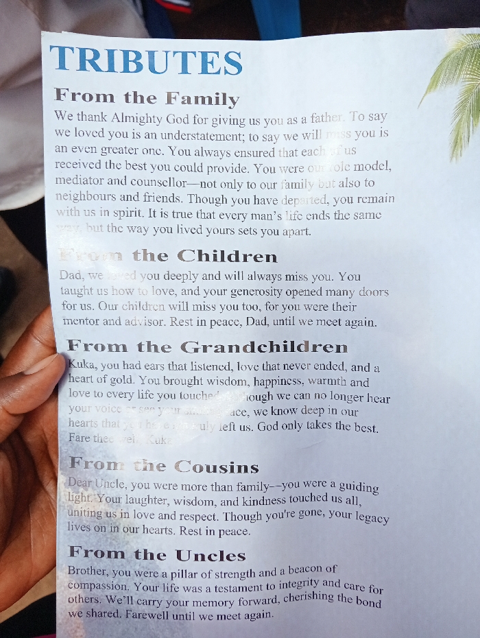 A human hand with dark skin tone is observed holding a white, glossy printed document, angled slightly to the left. The document features the bold, blue, sans-serif title "TRIBUTES" at the top. Below the title, the document presents eulogistic text divided into sections, beginning with "From the Family," "From the Children," "From the Grandchildren," "From the Cousins," and "From the Uncles," each with a distinct header. A faint, light green palm frond graphic is visible on the upper right portion of the document. The background is out of focus and dark, providing no specific details. The scene is located in Lumakanda ward, Kenya.