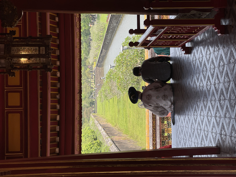 Two people sit on a tiled floor inside a building. One person wears a hat and a light-colored patterned robe. The other wears a dark plaid shirt. The building overlooks a green grassy area, a canal, trees, and another wall in the distance. Red and gold decorative elements line the building's frame, including railings and a hanging lantern.