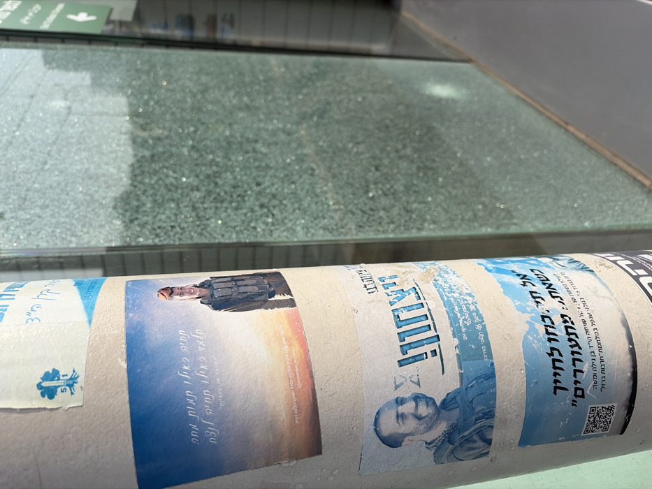 The image depicts a light-colored, cylindrical pole, likely metal or concrete, situated in an urban environment in Tel-Aviv, Israel. The pole is adorned with several overlapping informational and memorial stickers, predominantly featuring Hebrew text and images related to Israeli soldiers. From top to bottom, the visible stickers include: 1. A partially visible blue and white sticker featuring Hebrew text and a tree-like logo with the number "5.1". 2. A rectangular sticker showing a young, smiling male soldier in a military vest and a hat with a reddish beret against a backdrop of a sunset or sunrise sky. Hebrew text is present on the left side of this sticker. 3. Another rectangular sticker, featuring a smiling, bearded man in military attire (vest) on the left, next to the Hebrew word "ניצחון!" (Nitzachon! - Victory!) rendered in stylized blue letters. 4. A lower rectangular sticker with a light blue background, displaying Hebrew text that refers to an IDF soldier from "גדוד 51" (Battalion 51) and includes a QR code in the bottom-left corner. Adjacent to the pole on the right side is a vertical panel of glass, which appears to be textured or internally fractured (possibly safety glass that has been impacted, creating a spiderweb effect without complete breakage). This glass panel reflects ambient light and indistinct shapes from the surroundings. The scene is brightly illuminated by direct sunlight.