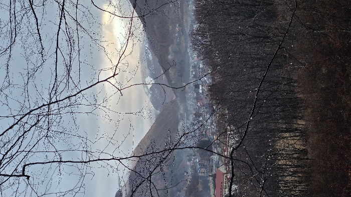 Bare branches frame a distant landscape, partially obscuring a valley town nestled beneath a sloping mountain