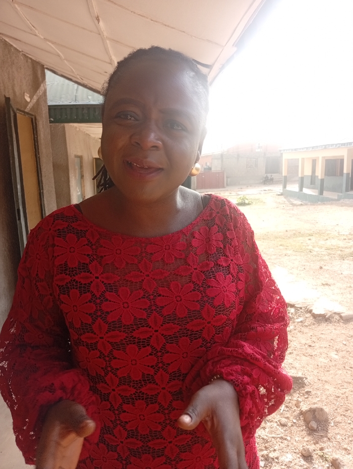 An African woman in a red, floral lace dress stands outside. She is facing the camera with a slight smile, her hands visible. The background shows a building with an open door to the left, and another building further away to the right under a bright, slightly washed-out sunlight. The ground appears to be a dirt surface. The woman is wearing golden earrings.