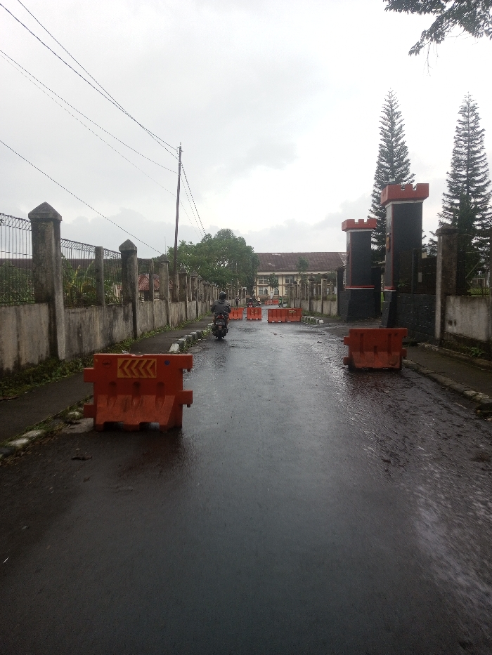 The image displays a wet asphalt road in Tangsibi, Bhutan, under an overcast sky. The road has a concrete curb and sidewalk on both sides. On the left, a concrete wall with regularly spaced pillars supports a metal fence, behind which vegetation and a multi-story building with a reddish-brown roof are visible. Overhead power lines are strung from a wooden utility pole located near the left sidewalk. On the right, two large, dark-colored gate pillars with red castellated tops stand prominently, flanked by tall evergreen trees behind them. Several orange plastic traffic barriers are positioned across the road, indicating a partial obstruction or controlled access. The barrier closest to the viewer on the left features yellow chevron markings. A single individual, wearing a dark jacket, is operating a black motorcycle, driving away from the viewer down the center of the road, navigating between the orange barriers. The road surface is visibly wet from recent rain, with standing water and minor runoff visible, particularly along the right side of the asphalt.