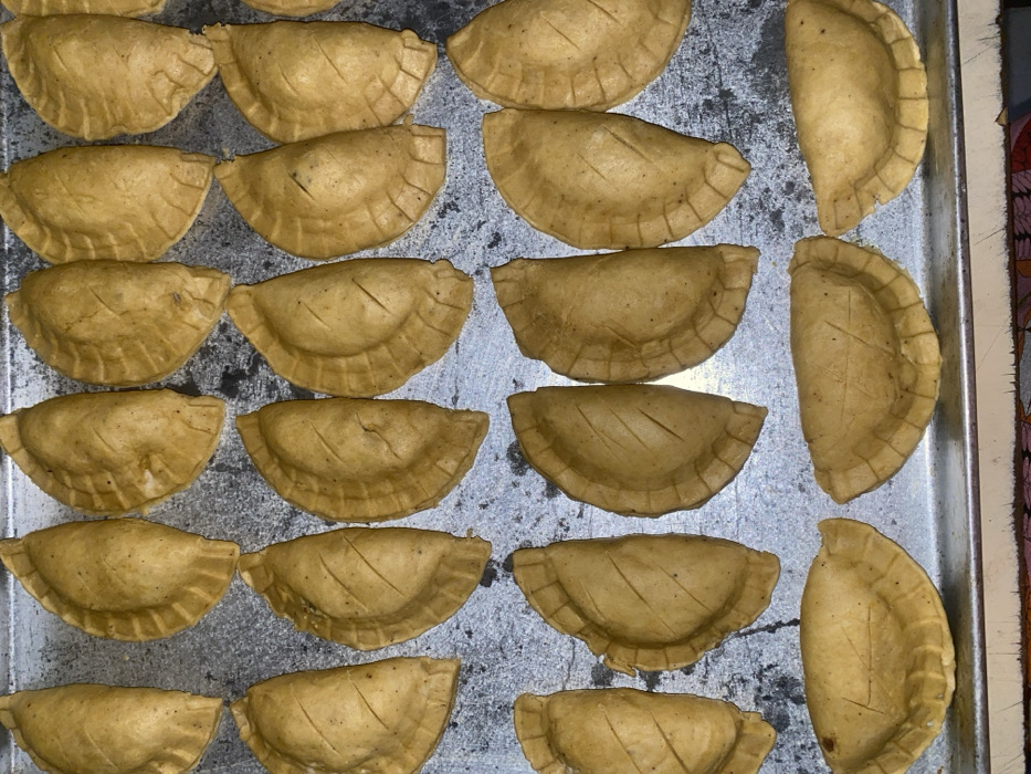 - "Twenty unbaked, light brownish-yellow, half-moon-shaped pastries are arranged on a rectangular, dull silver-gray metallic baking tray" by FM-rZumQ2, licensed under CC BY 4.0