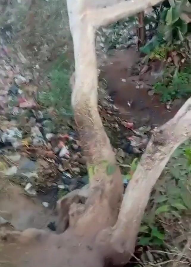 dirty stream bank filled with plastic trash and debris. A tree trunk is in the foreground, partially blocking the view of the stream. The ground is mostly dirt, with some grass and small rocks.
