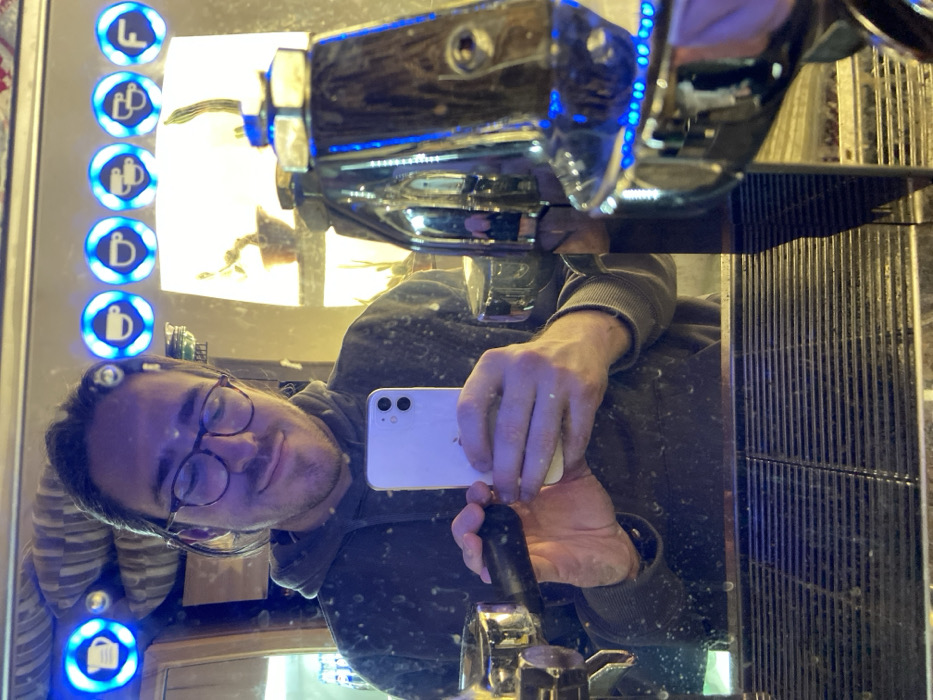 A man with glasses and a gray hoodie takes a selfie in a mirror. He holds a white smartphone, and a chrome espresso machine reflects in the mirror above him. The machine features illuminated buttons with various coffee symbols. The mirror is speckled with white spots, possibly water or cleaning residue. A metal grate is visible to the right.