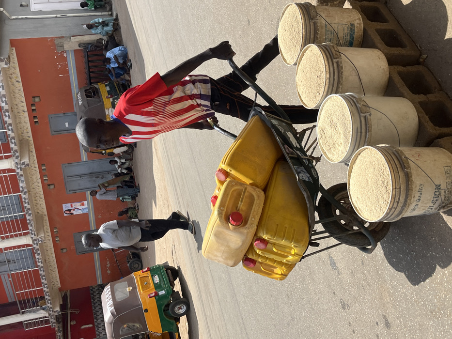 This image captures a sunny street scene in Jos, Nigeria. In the immediate foreground, a dark-skinned man with short dark hair, wearing a red, white, and blue striped short-sleeved t-shirt and dark trousers, is pushing a dark-colored wheelbarrow from right to left across the frame. The wheelbarrow is loaded with approximately five yellow plastic jerrycans, each fitted with a red cap. To the right of the wheelbarrow, on the street level, four white plastic buckets are arranged in a line on concrete blocks. Each bucket is filled to the brim with a light-colored granular substance. One bucket bears visible text, including "High Quality EMULSION." In the midground, a second dark-skinned man wearing a light grey short-sleeved shirt and dark pants walks away from the viewer, towards the left. A green and yellow three-wheeled motorized rickshaw, with "PINSLE" visible on its rear, is parked on the left side of the street. Across the street, an orange/red two-story building stands, featuring multiple windows, doors, and a white advertisement poster on its facade. Several men are seated or standing in groups in front of this building, largely in the shade. The scene is illuminated by bright daylight, casting distinct shadows from people and objects onto the street surface.