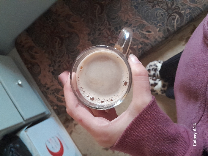 - "An indoor, top-down view in Khan Yunis, Palestinian Territory, shows a person holding a clear glass mug filled with a frothy, light brown beverage in their right hand" by FM-V8KrL2, licensed under CC BY 4.0